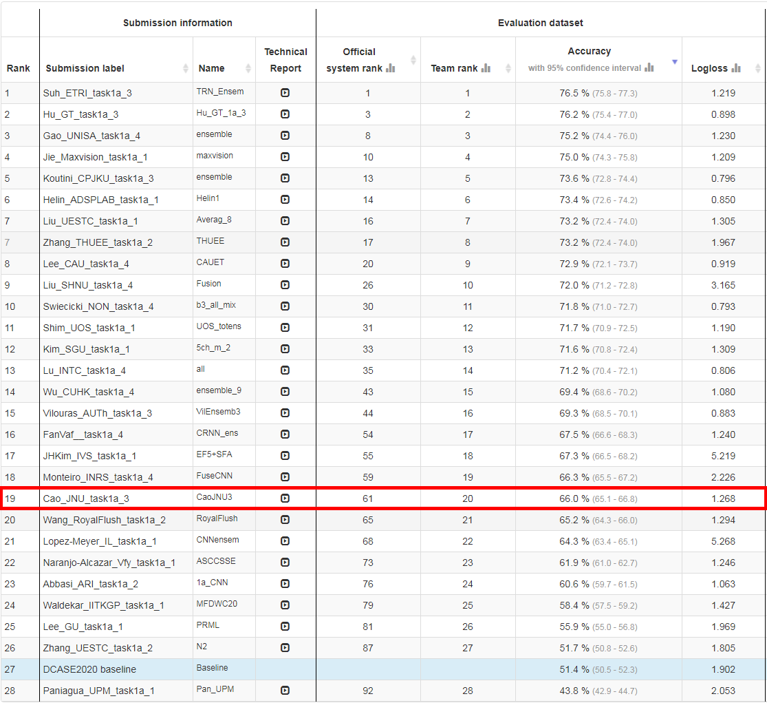 DCASE2020挑战赛共吸引了来自国内外计算机人工智能领域的高校、研究所和企业共138个队伍参赛。参赛队伍包括国内中国科学院大学、清华大学、上海交通大学、香港中文大学、电子科技大学、腾讯多媒体研究所等,以及国外美国加利福尼亚州因特尔实验室、韩国大田电子研究所、美国佐治亚理工大学电气与计算机工程学院、奥地利计算机感知研究所等。我校Cao_JNU团队使用具有原创性的N-DenseNet网络模型、多特征Mixup数据增强以及SVM模型集成等方法,最终以高出基线15%的分类准确率在Task 1中排名第19位