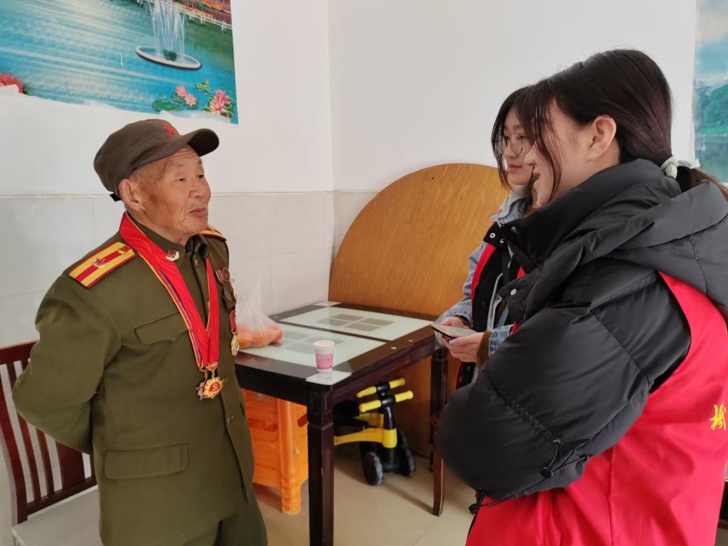 看望退伍军人的志愿者们与四位退伍老兵进行了交谈,听他们讲述部队里的生活。让大家印象最深刻的是一位97岁的高龄抗美援朝的老兵贾老。他是军队工程兵,参加过上甘岭等重大战役。他回忆的时候,非常自豪地告诉志愿者,他是队伍里身体最好的,往往第一个冲上山头,还因此荣获过一等功。退伍后,他当过保安科科长、抗过洪、当过人大代表......贾老还向志愿者们一个一个展示他衣服上的勋章,讲述那个战火纷飞的年代,讲述子弹擦着他的耳朵飞过,讲诉他的脊背支撑起倒塌的残垣。临走前,他说自己最遗憾就是没当过文化人,抗日战争让他错失学习的机会,他希望同学们在和平年代能好好学习,成为祖国的栋梁。老兵的一言一行都充斥着对党的热爱、对祖国的热爱,更给了同学们方向的感召,信仰的指引,前进的力量。
