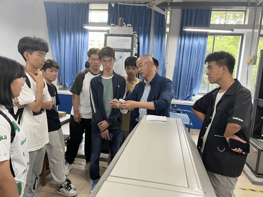 第三站,张能武、周文军老师带领学生走进材料力学性能检测实验室、先进制造实验室。老师们介绍了材料力学性能的检测设备及其在测量各种材料力学性能中的作用,各种机床的功能及其中涉及到的相关学科知识,并鼓励学生刻苦努力学习,打好坚实基础。