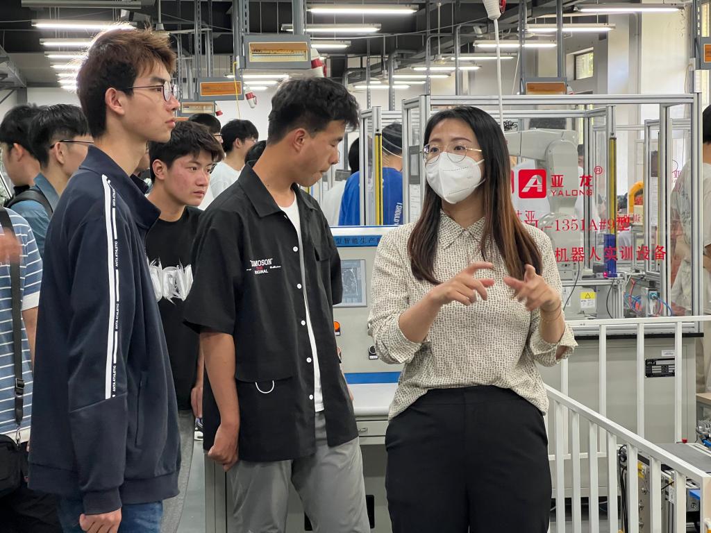 参观第一站来到了机器人包装及物流自动化实验室、机器人创新实践实验室、机器人编程控制实验室、PLC自动化综合实验室。学生通过李挺、左文娟老师的详细介绍,了解了机器人的结构与运行,并通过与多种类机器人的互动,进一步明晰专业发展现状及应用前景。