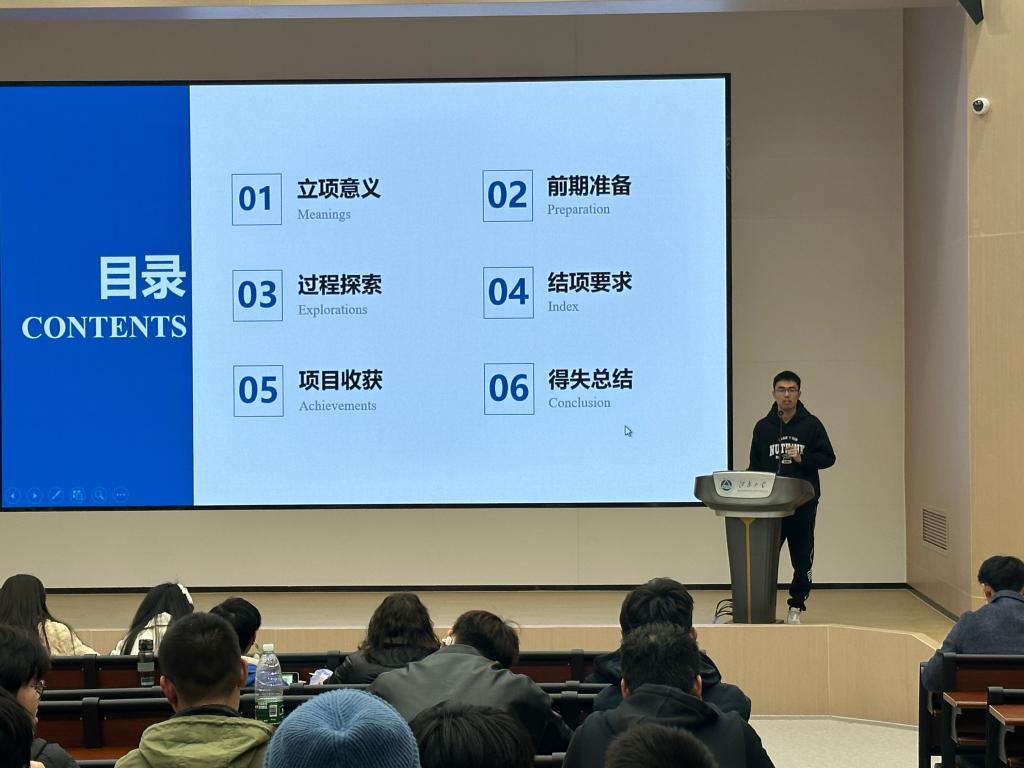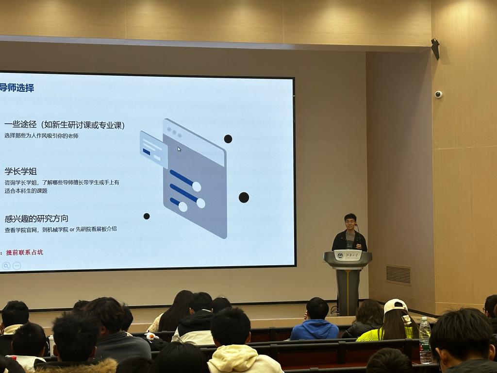 于11月27日晚在1C109举行了大学生创新创业训练经验分享会。此次分享会由机电2001班姚亚周同学和机械2104班陈道明同学主讲,辅导员张倩瑶及100余名2022级本科生参与了此次分享会。