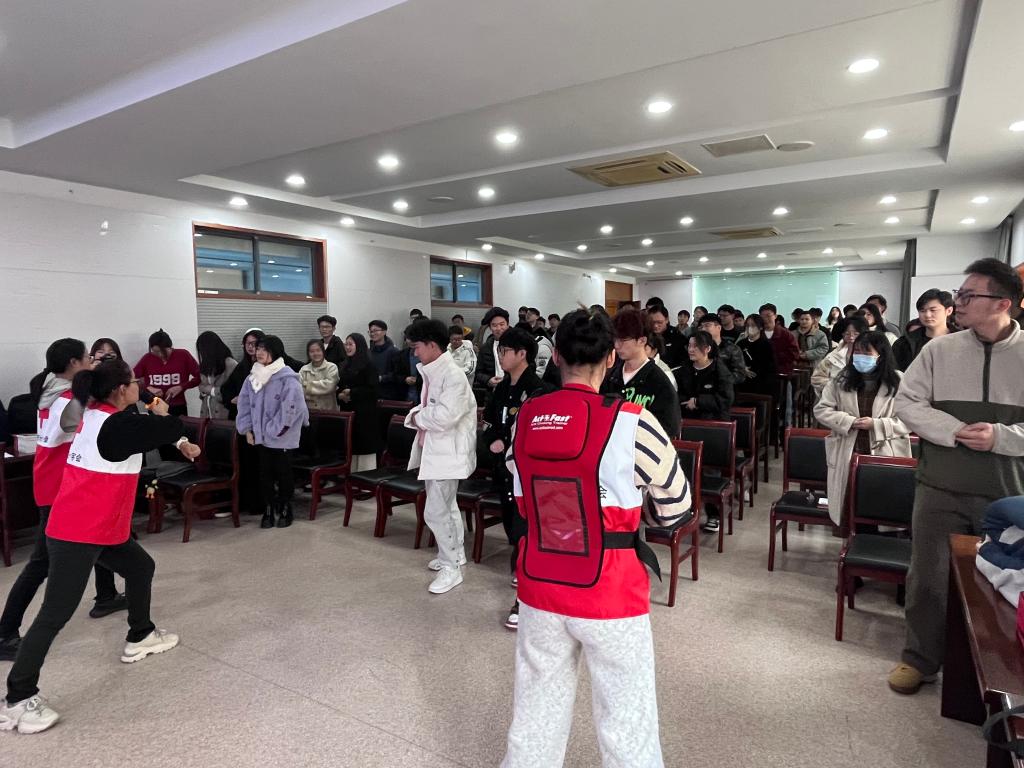讲座伊始,四位同学进行了情景演绎,生动展示了晕倒、触电、烫伤以及气道异物梗阻等常见突发情况,唐镇棣老师以此展开急救知识的讲解。在讲解过程中,她鼓励同学们积极提问并分享自己的经验,进一步激发在场学生的学习热情和思考能力。唐镇棣老师主要从晕倒、异物梗阻、心肺复苏三个方面进行急救知识理论与实操的讲授。首先,针对晕倒突发情况,唐镇棣老师向现场同学展示了如何正确对患者翻身并打开其气道的方法。接着,针对气道异物梗阻的突发情况,两位协助老师进行了海姆立克急救法的实际演示并带领现场同学们进行练习,使每位参与者都能够熟练掌握相应技能。最后,唐镇棣老师聚焦于心肺复苏方法(CPR),向现场同学讲解了如何在有效的抢救时间内对呼吸心跳骤停的患者进行应急救护,借用人体模型生动形象地介绍了自动体外除颤器(AED)的使用方法,并与两位协助老师进行了实操演练教学。将理论知识与技能实操结合,通俗易懂,生动形象,有效增强了同学们的急救知识技能。讲座结束时,唐镇棣对所讲急救内容进行了回顾总结,并鼓励参与者将所学知识运用到实践中。她还提醒大家,即使经过了培训,急救技能也需要不断巩固和更新。