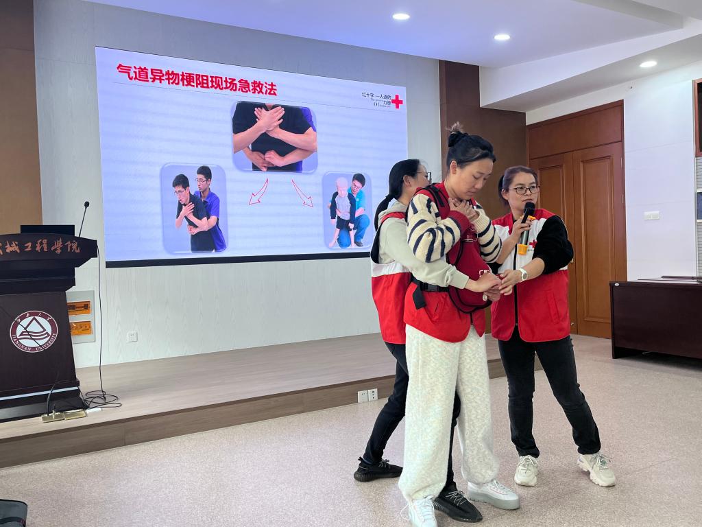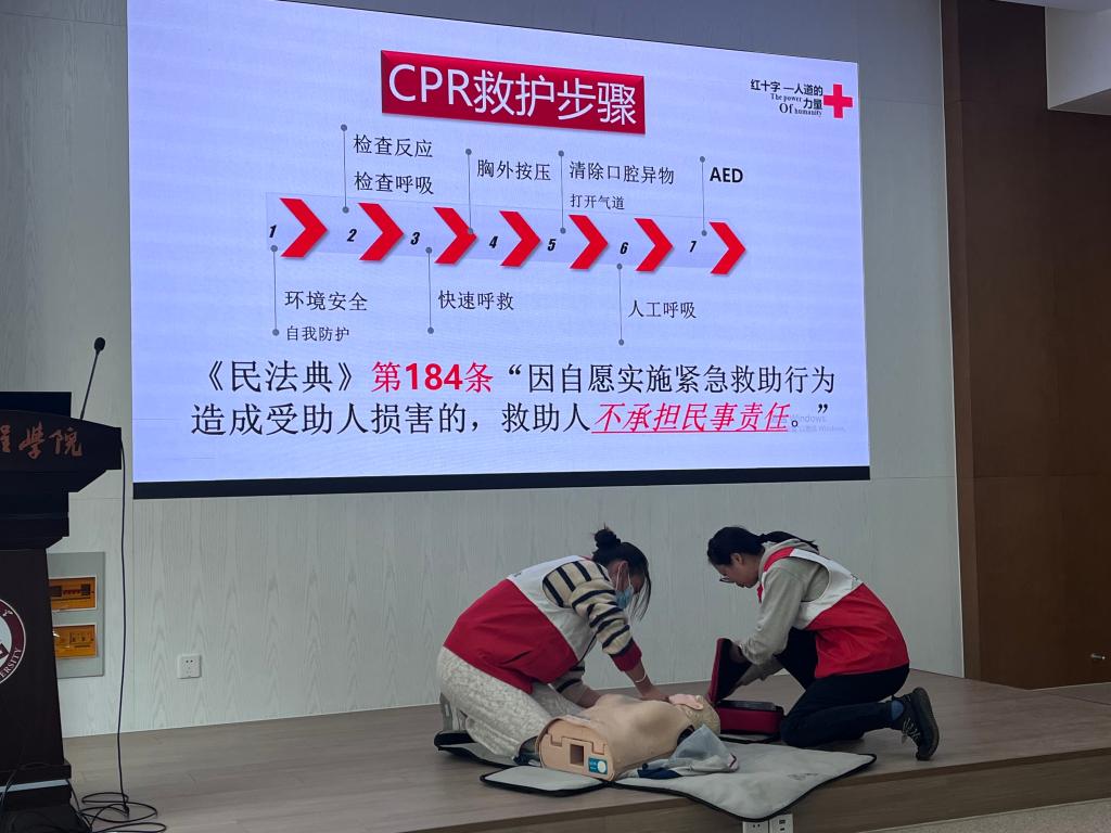 此次讲座特邀了红十字会救护培训师、无锡市红十字赈济救援队副队长唐镇棣主讲,红十字会救护培训师吴珂玥、助教老师徐亚军现场协助。讲座通过对急救知识的讲解、急救情况视频播放和现场带领学生实际演练等方式,全面介绍了救护相关法律法规、应急救护流程以及日常意外和急症的救护原则。