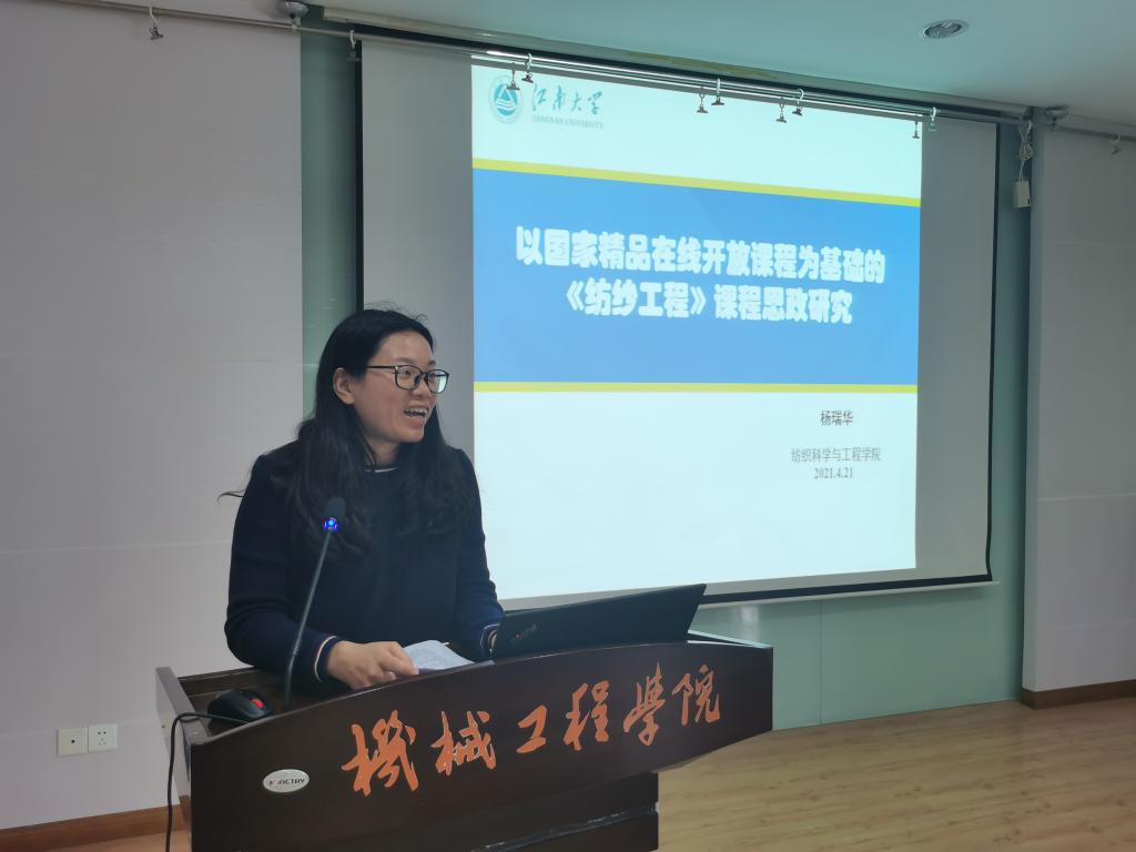 接着,纺织科学与工程学院杨瑞华老师应邀作了题为《以国家精品在线开放课程为基础的纺纱工程课程思政研究》的报告,以国家精品在线开放课程《纺纱工程》为例,与大家进行了经验分享:一是通过修改教学大纲,将课程思政列入培养目标;发掘思政元素,构建包含哲学、爱国、爱专业、做人和做事的《纺纱工程》思政教学体系。二是以思政教学体系为指导,国家精品在线开放课程 《纺纱工程》为平台,实施线上下紧密结合的SPOC和翻转课堂教学形式;探索程思政的情景新模式。三是建立纺纱工程课思政系列案例,逐步形成库和微视频集锦。四是建立课程思政具体考核量化方法。