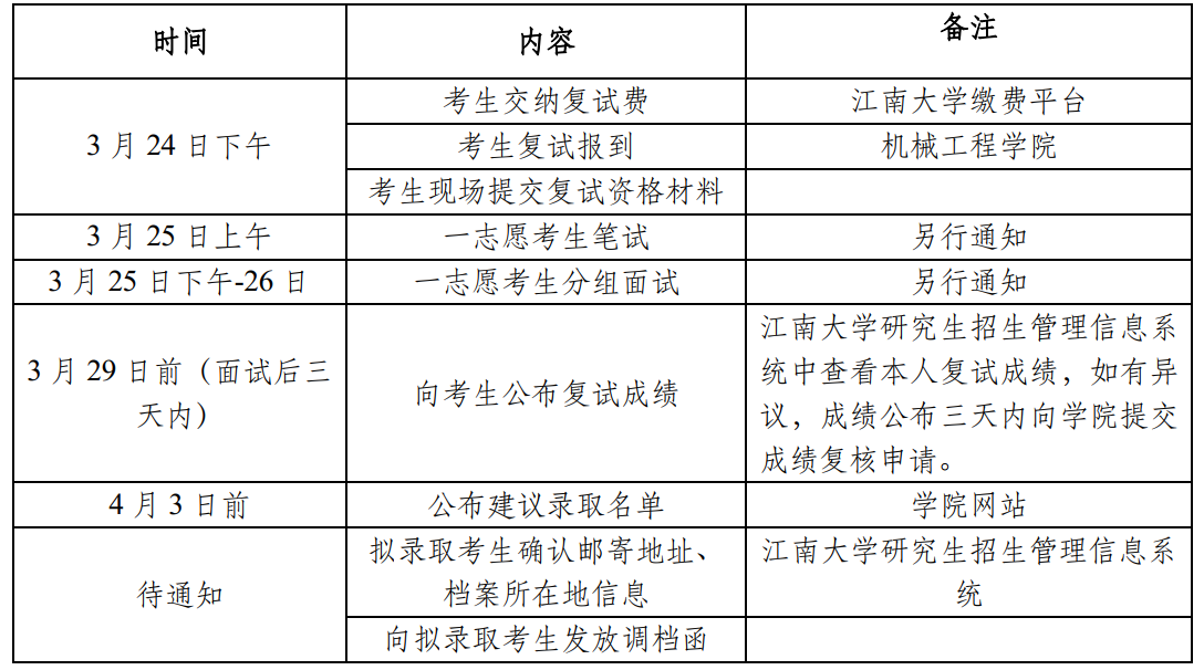 缴费说明:进入复试考生在学院规定的时间内登录“江南大学缴费平台”交纳复试费用,复试收费标准:80元/生。考生搜索微信公众号“江南大学财务处”,在“业务办理”中选择“学生缴费”,或登录“江南大学网上缴费平台”(网址://pay.huioneyl.com/payment/);登录账号为身份证号,登录密码为准考证号后六位(友情提醒:考生账号已开通,切勿自行注册)。按照提示交费,并打印或截图保存付费凭证。