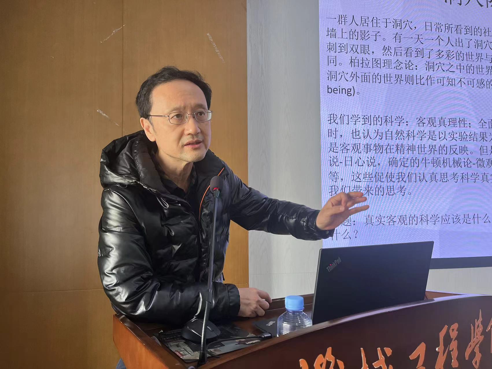 首先,王泉和师生们交流了学习科学的客观真理性、全面性、逻辑性,通过具体例子探讨科学的应用价值、文化价值和精神价值,他通过讲述个人对科学发展史和三个阶段的划分,来进一步理解和看待科学是否具有确定性,以及如何在学习中产生强大的求知力量。接着,是交流互动环节,王泉与参会师生进行了深入交流研讨,他鼓励年轻学者不仅要学习书本上的知识,更应该注重领悟“公理、公式”背后的哲学思想,用思想引领科学研究,推动科学发展。