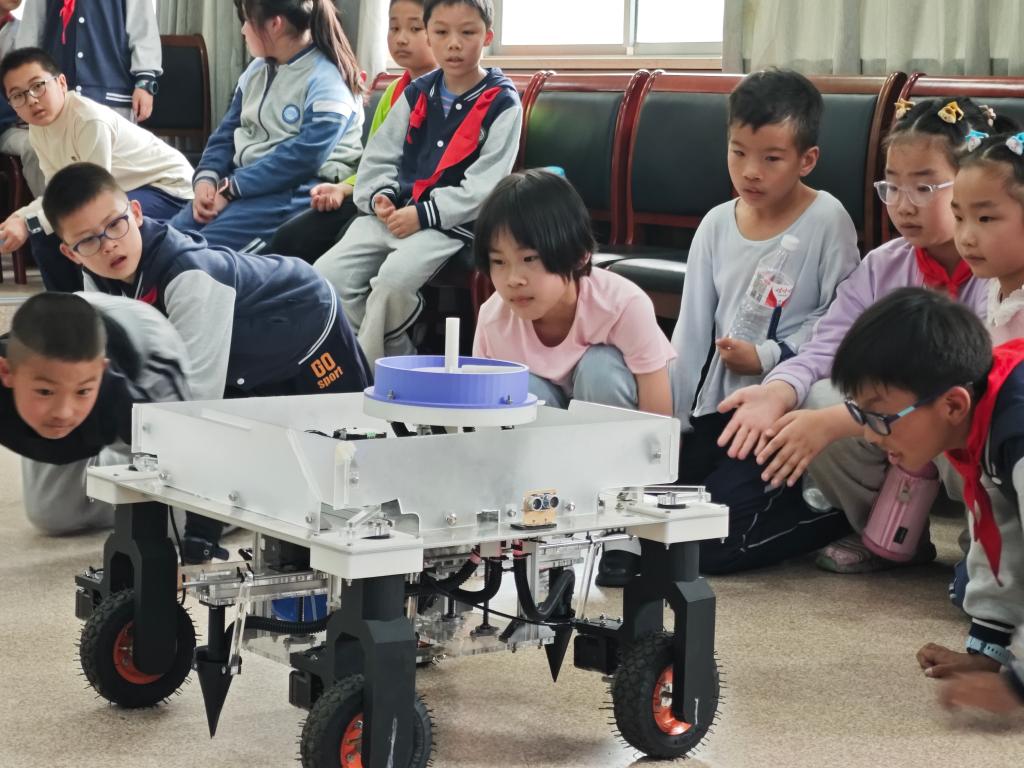 “小车是怎么实现播种的?”“垃圾分类机器人可以走进千家万户么?”现场的小朋友们在交流互动环节更是踊跃发言,奇思妙想频出,大学生们一一耐心解答。