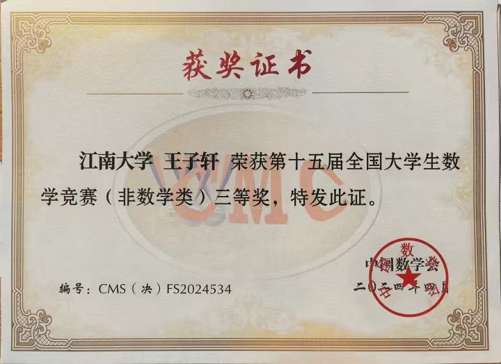 学生王子轩在决赛中表现优异,喜获全国三等奖的佳绩。