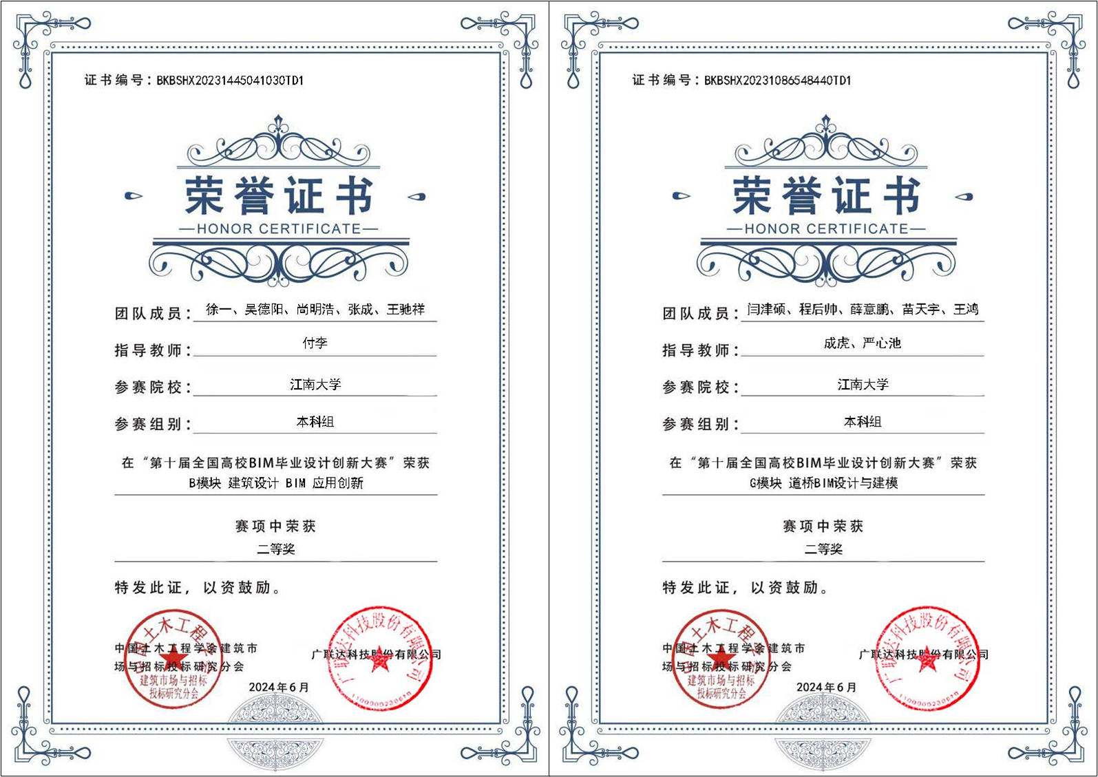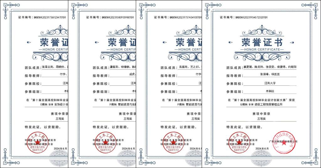 土木工程专业徐一、吴德阳、尚明浩、张成和王驰祥同学荣获B模块(建筑设计BIM应用创新)二等奖,闫津硕、程后帅、薛意鹏、苗天宇和王鸿同学荣获G模块(道桥BIM设计与建模)二等奖,袁嘉南、王之祁、完锐、邹松良和韩丰阳同学,以及唐嘉阳、杨锋帆、陈靳南、徐亚东和李嘉诚同学荣获F模块(智能建造与装配式建筑)三等奖,土木工程专业张泽运南、周晓伶、袁子润和设计学院黄心恬、万翔同学荣获C模块(BIM装饰设计全过程应用)三等奖,土木工程专业姜夏璐、陈美玲、徐雯雯、柴健炜和设计学院向晴阳同学荣获E模块(BIM建设工程项目管理应用)三等奖。