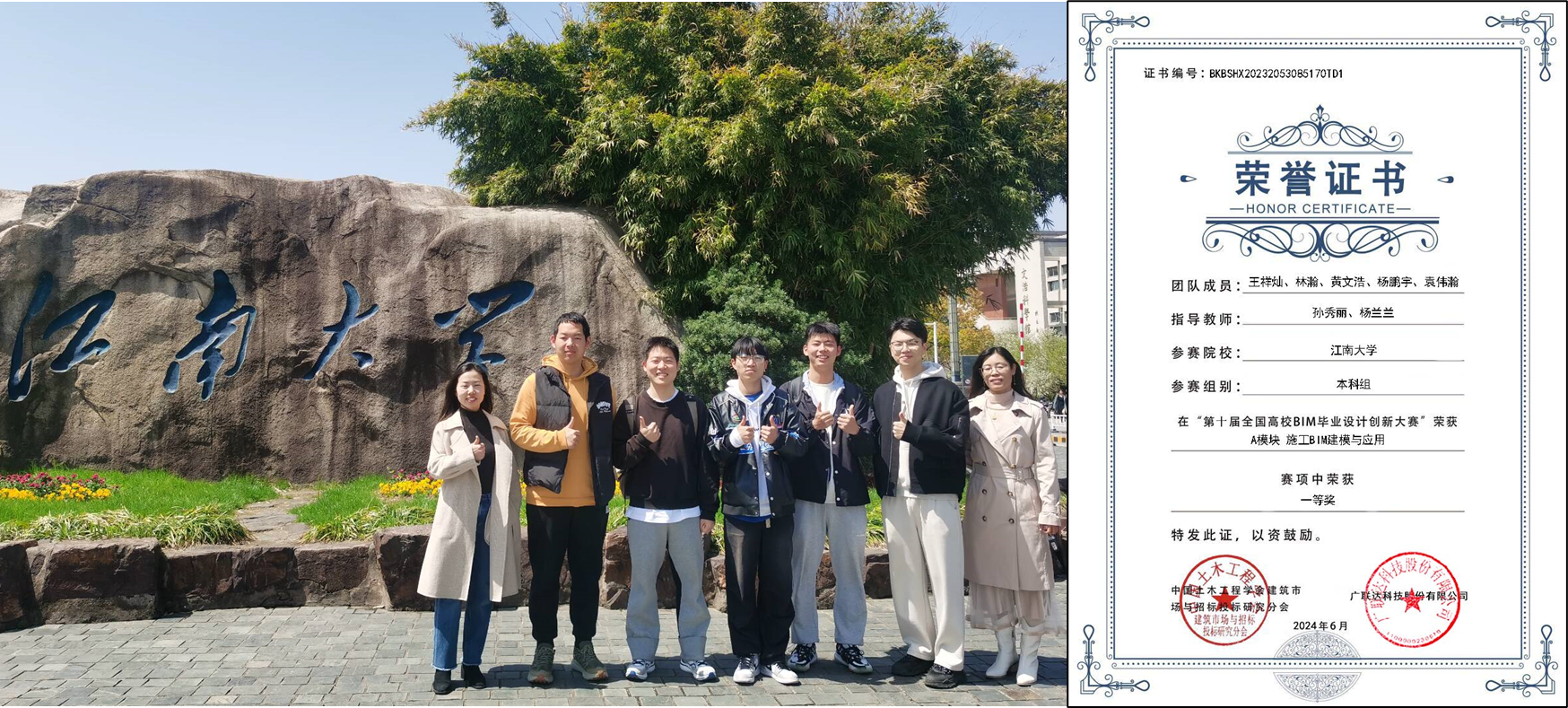 在付李、成虎、杨兰兰、孙秀丽、张清峰等老师的指导下,土木工程专业王祥灿、林瀚、黄文浩、杨鹏宇和设计学院袁伟瀚同学共同完成的作品,获最高奖项全国一等奖,为我校参加该赛事以来在A模块(施工BIM建模与应用)取得的最好成绩。