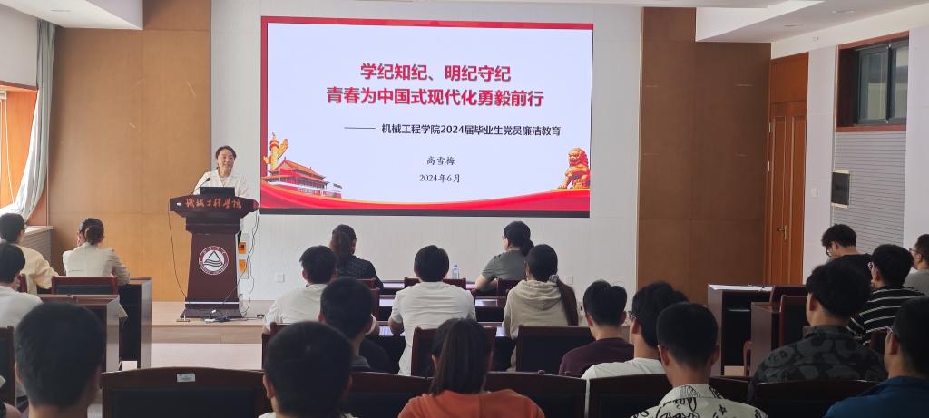 举办党纪学习教育专题党课暨毕业生党员教育大会。学院党委书记高雪梅,党委副书记兼副院长刘升恒,专职组织员梁楠,学工办主任、分团委书记孟召双及全体毕业生党员参会。会议由党建辅导员宋京姝主持。