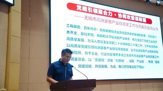 市委组织部组织三处副处长陈磊、市工业和信息化局装备与消费品产业处处长祁建伟共同为“无锡市高端装备产业链党建工作协调委员会”揭牌。华中科技大学无锡研究院副院长浦栋麟代表秘书长单位为无锡市高端装备产业链党建工作委员会副主任单位授牌。华中科技大学无锡研究院副院长王立成宣读了《无锡市高端装备产业链党建工作协调委员会倡议书》。